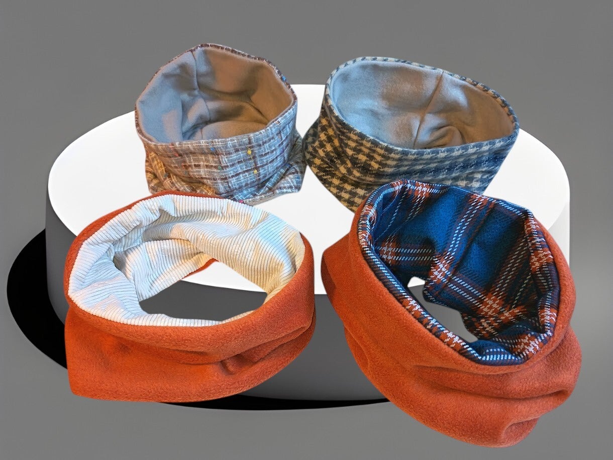 Ces snoods, tous uniques par leurs coloris et leurs matières, offrent une douceur enveloppante et une chakeur réconfortante.
